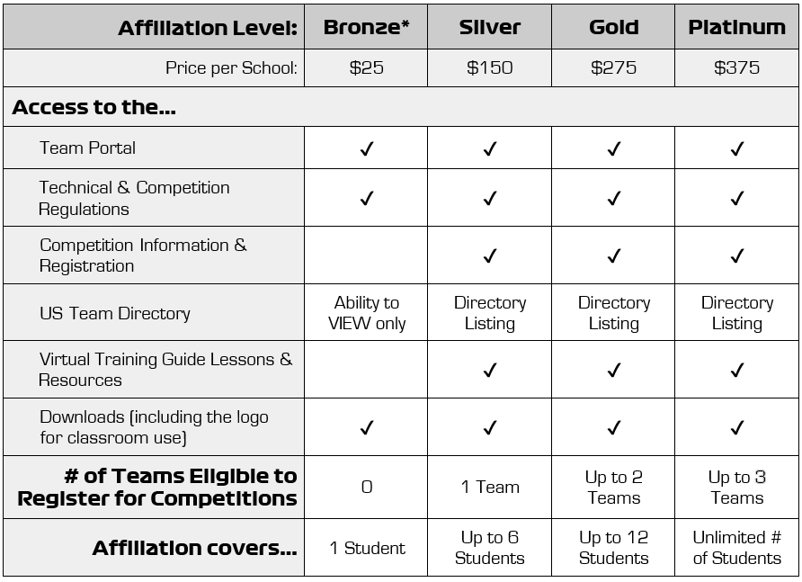 *Accounts can upgrade their affiliation level at any time (i.e. if your school adds teams during the school year, you can upgrade your account prior to competition in order to register multiple teams for the Regional Finals).