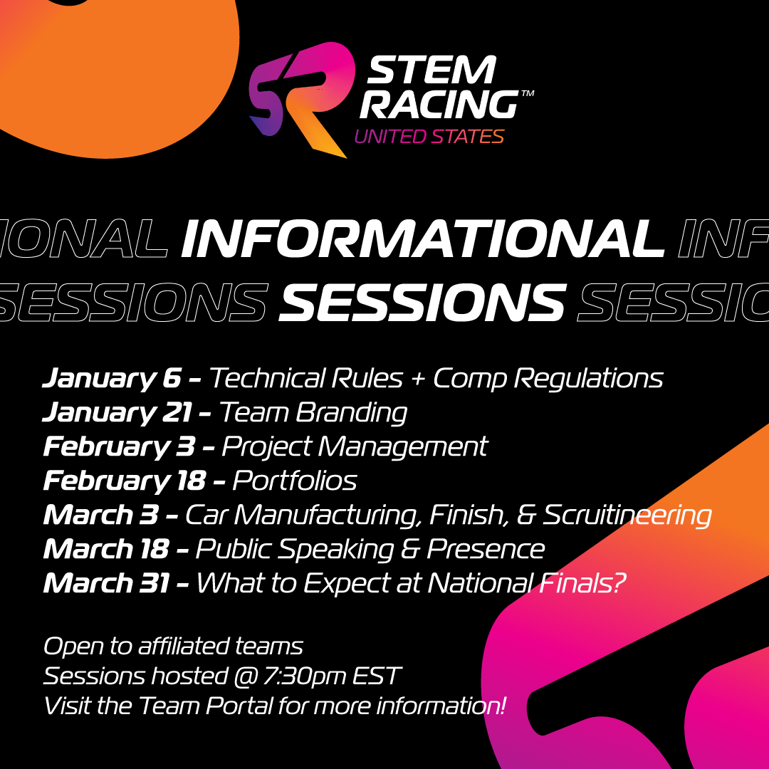 Join us for our Informational Sessions to get started on your STEM Racing Challenge! Informational sessions are 45 minute Zoom calls to help students around varying topics related to the challenge. Open to affiliated teams only, make sure to affiliated today!